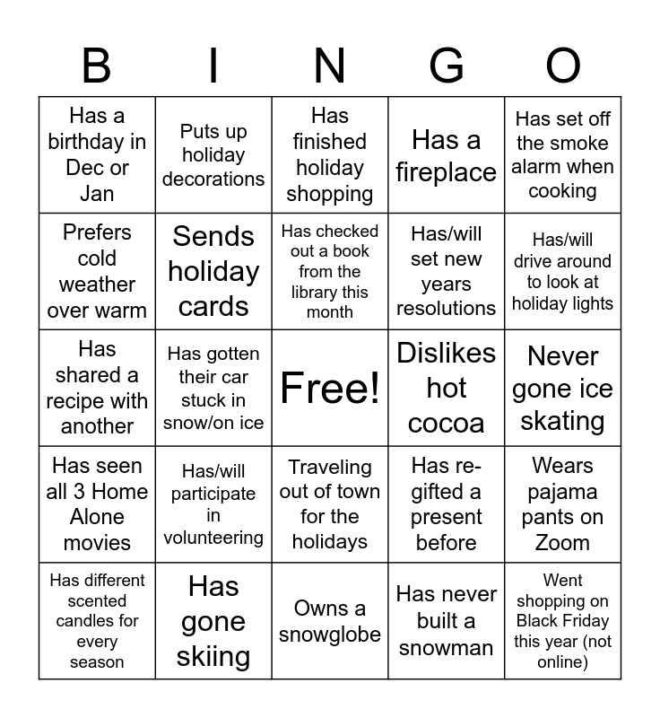 This bingo card has a free space and 30 words: Has gone skiing, Likes egg nog, Has gotten their car stuck in snow/on ice, Has been on a cruise in winter, Has a birthday in Dec or Jan, Has finished holiday shopping, Sends holiday cards, Traveling out of town for the holidays, Dislikes hot cocoa, Owns a snowglobe, Never gone ice skating, Went shopping on Black Friday this year (not online), Has never built a snowman, Has two or more pets, Has/will drive around to look at holiday lights, Can name all 9 reindeer, Has re-gifted a present before, Has seen all 3 Home Alone movies, Has/will participate in volunteering, Has set off the smoke alarm when cooking, Has shared a recipe with another, Not taking PTO between Dec 25 and Jan 2., Puts up holiday decorations, Has/will set new years resolutions, Prefers cold weather over warm, Has a fireplace, Wears pajama pants on Zoom, Has different scented candles for every season, Has checked out a book from the library this month and Has seen The Nutcracker.