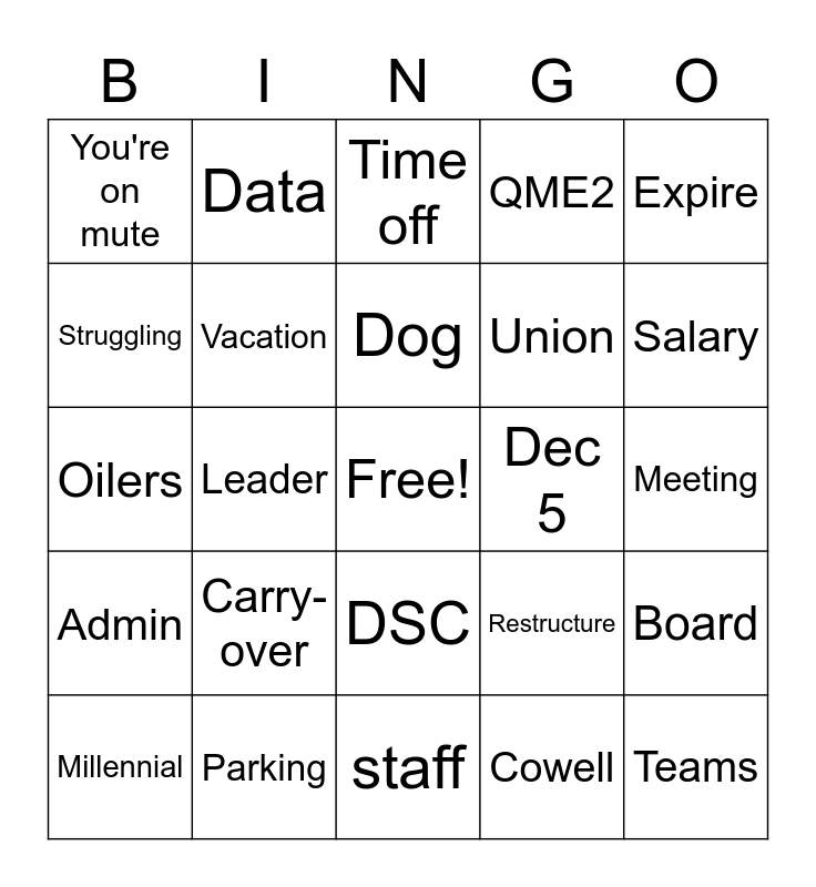 This bingo card has a free space and 24 words: Carry-over, Parking, Dog, Millennial, Expire, You're on mute, Struggling, Data, Dec 5, DSC, Union, Oilers, Restructure, Board, Vacation, Cowell, Meeting, Time off, Salary, Leader, Teams, Admin, QME2 and staff.
