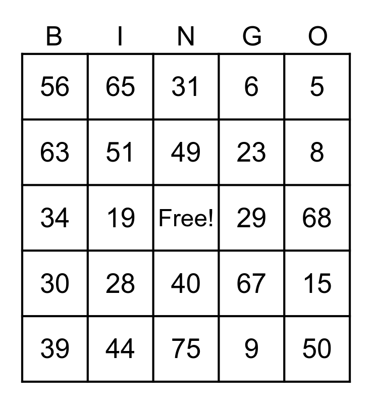 This bingo card has a free space and 75 words: 1, 16, 31, 47, 61, 2, 17, 32, 48, 62, 3, 18, 49, 63, 4, 19, 33, 50, 64, 5, 20, 34, 51, 65, 6, 21, 35, 52, 66, 7, 22, 36, 53, 67, 8, 23, 37, 54, 68, 9, 24, 38, 55, 69, 10, 25, 39, 56, 70, 11, 26, 40, 57, 71, 12, 27, 41, 58, 72, 13, 28, 42, 59, 73, 14, 29, 43, 60, 74, 15, 30, 44, 46, 75 and 45.