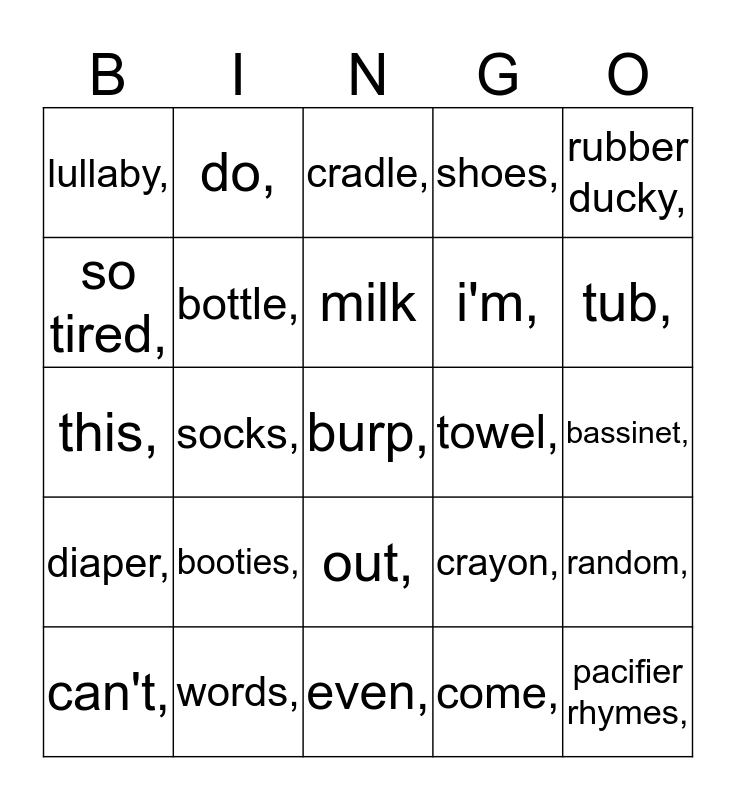 This bingo card has 36 words: Free!, bib,, blanket,, bottle,, crayon,, diaper,, milk, napkin,, rubber ducky,, safety pin,, socks,, shoes,, spoon,, towel,, tub,, lullaby,, pacifier rhymes,, booties,, burp,, cradle,, bassinet,, random,, words,, can't,, even,, do,, this,, anymore,, i'm,, so tired,, what,, will,, come,, out,, of, and bingo.