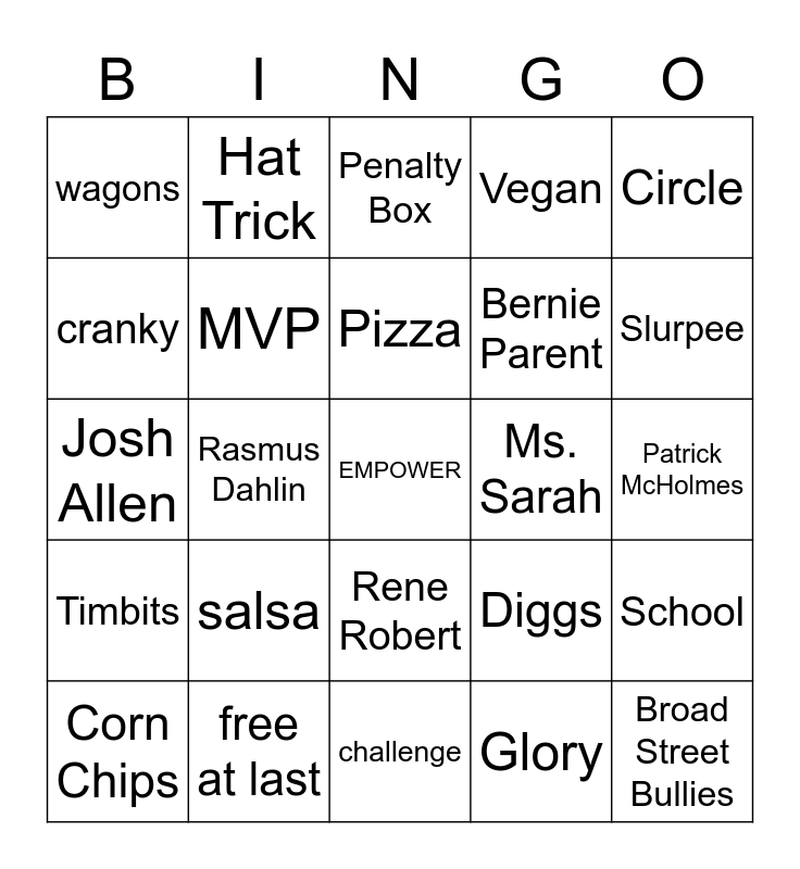 This bingo card has a free space and 24 words: Corn Chips, salsa, Pizza, Glory, Circle, wagons, Hat Trick, Penalty Box, Ms. Sarah, Patrick McHolmes, Josh Allen, MVP, Diggs, School, cranky, free at last, challenge, Vegan, Slurpee, Timbits, Rasmus Dahlin, Rene Robert, Bernie Parent and Broad Street Bullies.