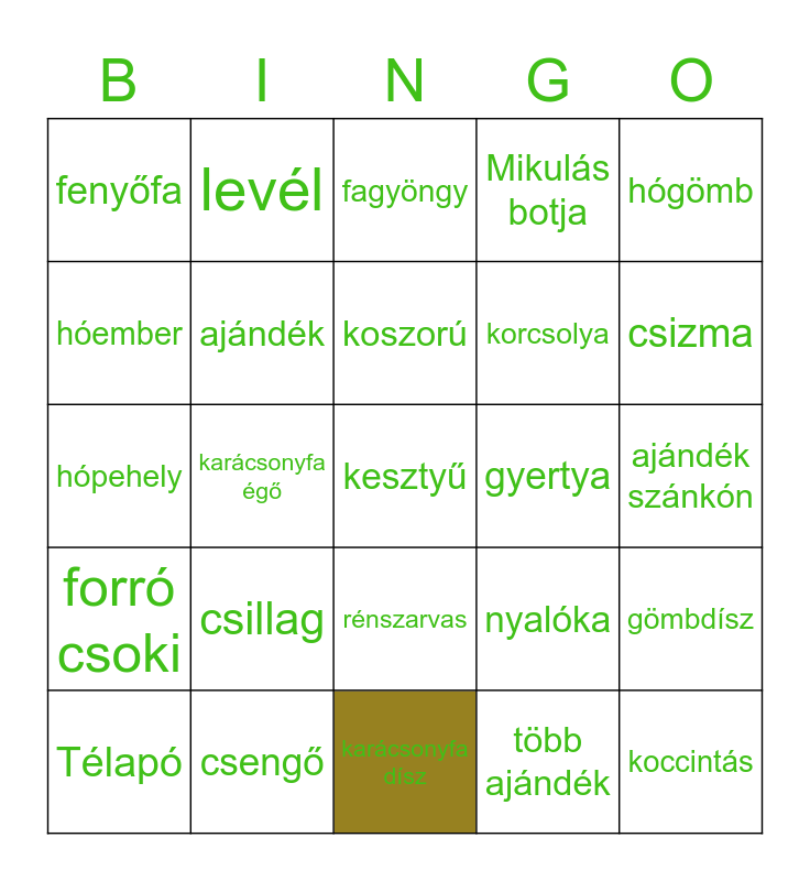 This bingo card has a free space and 24 words: csillag, csengő, koszorú, Télapó, hógömb, fenyőfa, hóember, levél, gyertya, rénszarvas, korcsolya, hópehely, nyalóka, gömbdísz, ajándék, több ajándék, ajándék szánkón, fagyöngy, csizma, karácsonyfa égő, koccintás, forró csoki, Mikulás botja and karácsonyfa dísz.