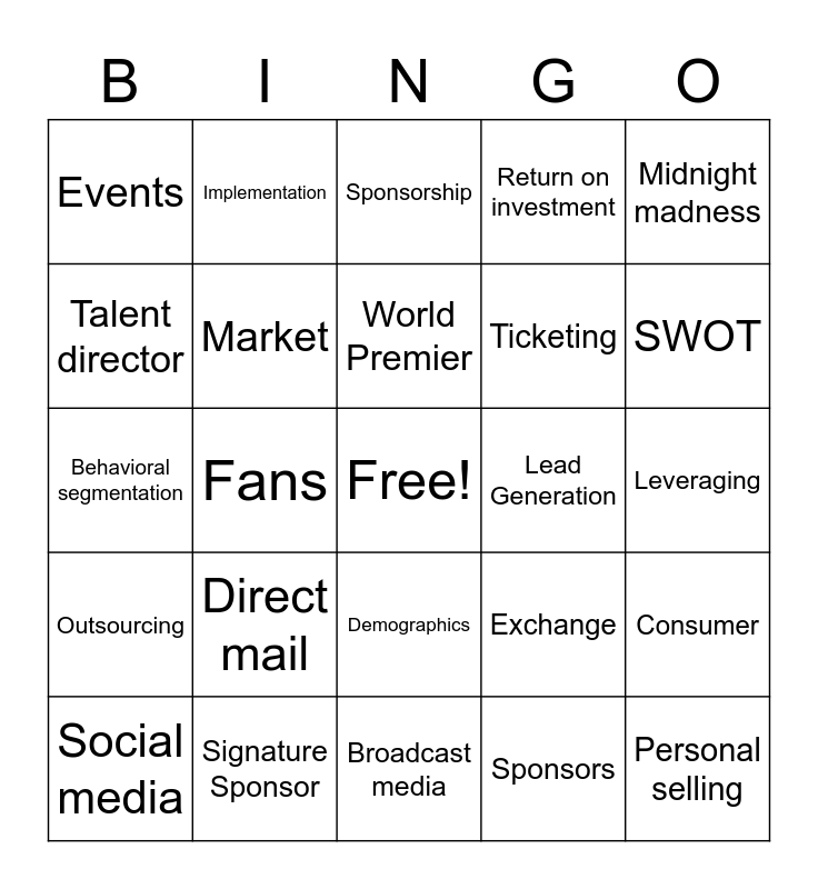 This bingo card has a free space and 52 words: Public relations, Personal selling, Sales promotion, Broadcast media, Direct mail, Situation analysis, Implementation, Media strategies, Talent director, Marketing director, Market, Producer, Consumer, Exchange, Marketing Concept, Marketing Mix, World Premier, Lead Generation, Advertising, Midnight madness, Fans, Sponsors, Events, Ticketing, Venue, Concessions, Seating, Staffing, SWOT, Hospitality, Consumer evaluations, Return on investment, Capacity, Perceived crowding, Security, Sponsorship, Signature Sponsor, Title Sponsor, Marketing through sports, Ambush marketing, Target market, Leveraging, Outsourcing, Market segmentation, Demographics, Psychographics, Geographics, Behavioral segmentation, Fan-fun events, Memorabilia, Social media and Customer relationship.