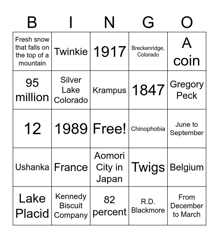 This bingo card has a free space and 39 words: 80%, Six sides, Three to four miles per hour., Silver Lake Colorado, Lake Placid, Aomori City in Japan, Krampus, Four inches, A coin, Ushanka, 1989, Breckenridge, Colorado, From December to March, June to September, Chinophobia, France, Apple, Fresh snow that falls on the top of a mountain, Joseph Heller, Twigs, 95 million, 82 percent, 1847, Gregory Peck, Howdy Doody, Mary Poppins, Nine, Neil Sedaka, “The Twist”; Chubby Checker, Twinkie, Apollo 13 And Apollo 14, Ernie, 1917, Kennedy Biscuit Company, R.D. Blackmore, 1902, Belgium, 12 and San Francisco.