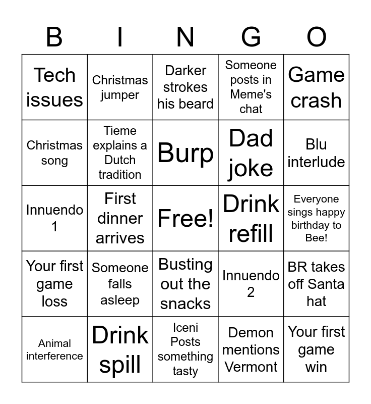 This bingo card has a free space and 24 words: Someone falls asleep, Drink spill, Burp, Animal interference, Game crash, Tech issues, Christmas song, Christmas jumper, Drink refill, Busting out the snacks, Dad joke, Innuendo 1, Innuendo 2, BR takes off Santa hat, Tieme explains a Dutch tradition, Demon mentions Vermont, Everyone sings happy birthday to Bee!, Darker strokes his beard, Blu interlude, First dinner arrives, Your first game win, Your first game loss, Someone posts in Meme's chat and Iceni Posts something tasty.
