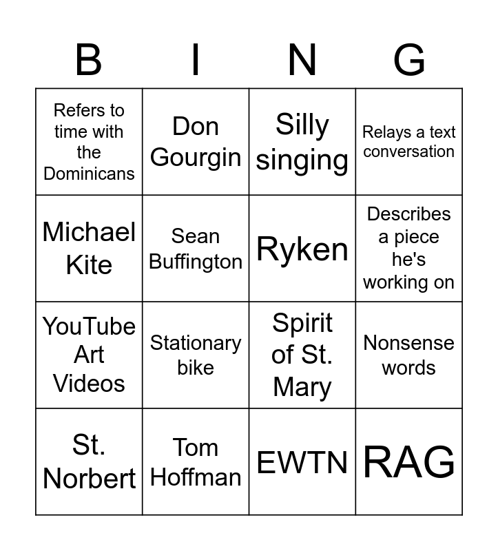 This bingo card has 16 words: Tom Hoffman, Nonsense words, Silly singing, Refers to time with the Dominicans, YouTube Art Videos, Don Gourgin, Spirit of St. Mary, EWTN, Michael Kite, Sean Buffington, St. Norbert, Relays a text conversation, Stationary bike, Describes a piece he's working on, Ryken and RAG.