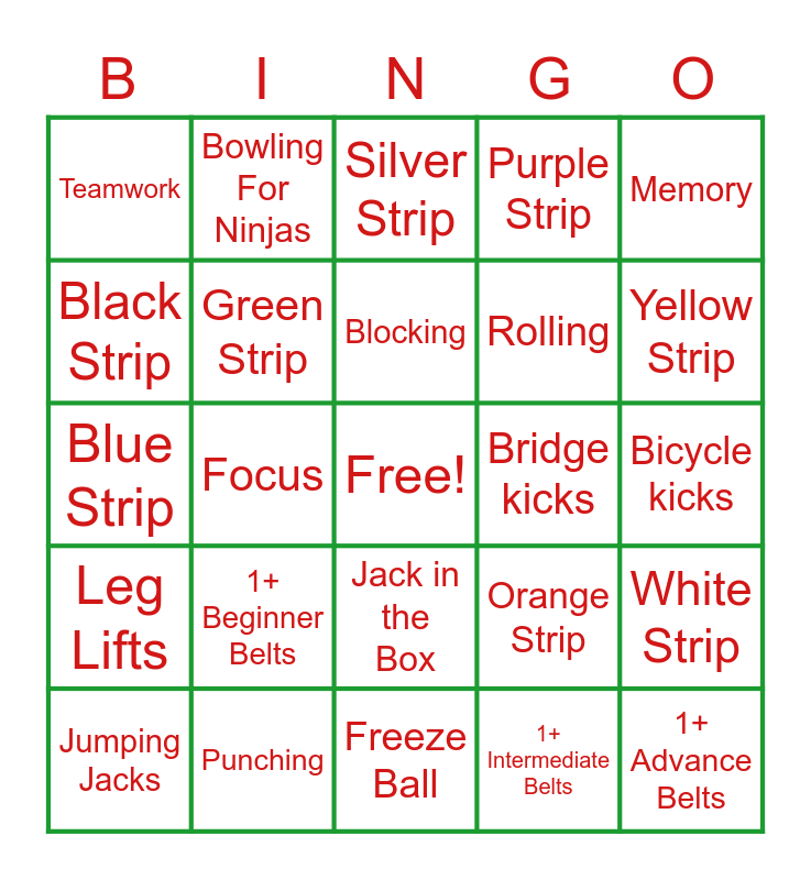 This bingo card has a free space and 31 words: Kicking, Punching, Blocking, Running, Memory, Teamwork, Focus, Freeze Ball, Rolling, 1+ Advance Belts, Jumping Jacks, 1+ Beginner Belts, 1+ Intermediate Belts, Push Ups, Leg Lifts, Seal Taps, Jack in the Box, Bridge kicks, Bicycle kicks, Frankensteins, Bowling For Ninjas, Red Strip, Orange Strip, Yellow Strip, Blue Strip, Green Strip, Silver Strip, Purple Strip, White Strip, Black Strip and Spot Our Elf.
