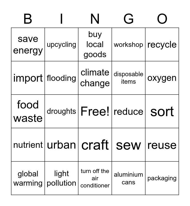 This bingo card has a free space and 31 words: turn off the air conditioner, not litter, droughts, flip, save energy, buy local goods, flooding, sew, reduce, aluminium cans, sort, packaging, rising sea levels, plastic shopping bags, oxygen, harmful, reuse, urban, nutrient, craft, recycle, ornament, global warming, upcycling, disposable items, import, workshop, food waste, light pollution, climate change and carbon dioxide.