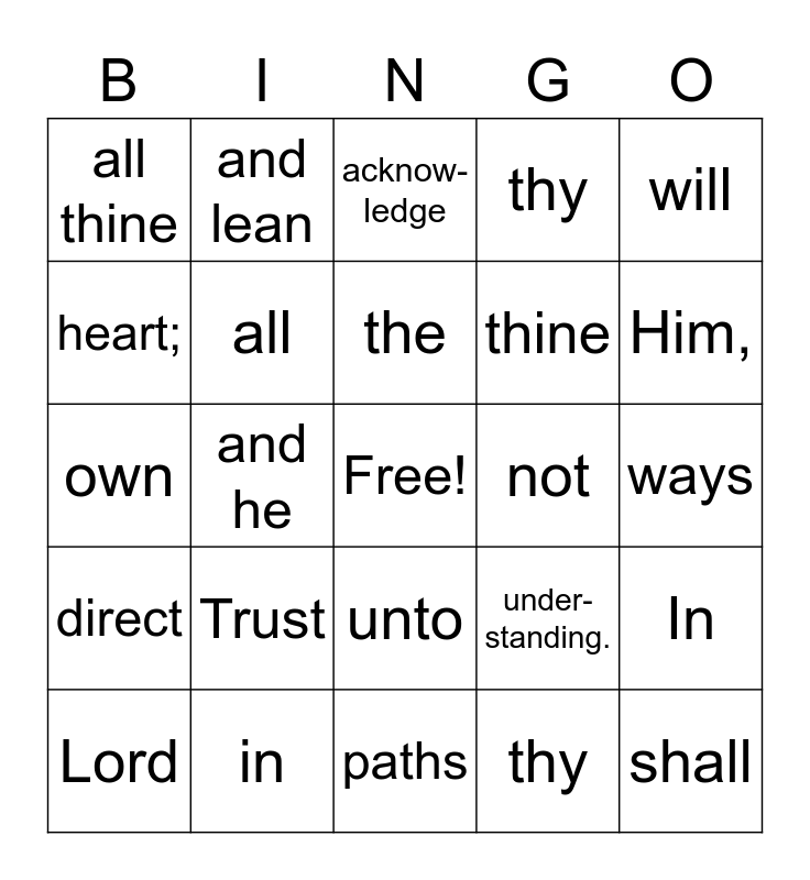 This bingo card has a free space and 24 words: Trust, in, the, Lord, will, all thine, heart;, and lean, not, unto, thine, own, under- standing., In, all, thy, ways, acknow- ledge, Him,, and he, shall, direct, thy and paths.