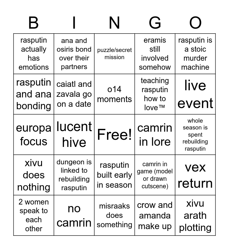 This bingo card has a free space and 24 words: dungeon is linked to rebuilding rasputin, no camrin, o14 moments, 2 women speak to each other, rasputin is a stoic murder machine, rasputin actually has emotions, rasputin and ana bonding, ana and osiris bond over their partners, camrin in lore, rasputin built early in season, teaching rasputin how to love™, europa focus, camrin in game (model or drawn cutscene), vex return, caiatl and zavala go on a date, crow and amanda make up, whole season is spent rebuilding rasputin, puzzle/secret mission, live event, lucent hive, xivu arath plotting, xivu does nothing, eramis still involved somehow and misraaks does something.