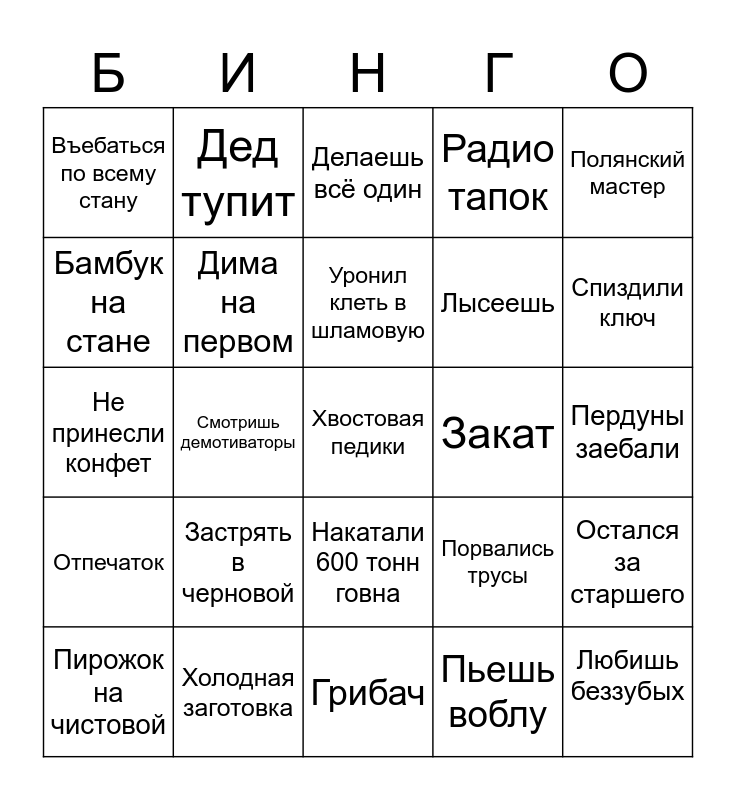 This bingo card has a free space and 24 words: Застрять в черновой, Холодная заготовка, Уронил клеть в шламовую, Пирожок на чистовой, Полянский мастер, Въебаться по всему стану, Бамбук на стане, Дед тупит, Закат, Накатали 600 тонн говна, Лысеешь, Не принесли конфет, Порвались трусы, Остался за старшего, Дима на первом, Пьешь воблу, Пердуны заебали, Делаешь всё один, Спиздили ключ, Смотришь демотиваторы, Любишь беззубых, Отпечаток, Радио тапок and Грибач.