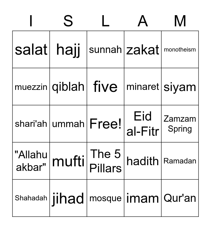 This bingo card has a free space and 24 words: mufti, jihad, five, Shahadah, monotheism, salat, muezzin, hajj, Eid al-Fitr, The 5 Pillars, minaret, shari'ah, hadith, Ramadan, qiblah, imam, Zamzam Spring, sunnah, siyam, ummah, Qur'an, "Allahu akbar", zakat and mosque.