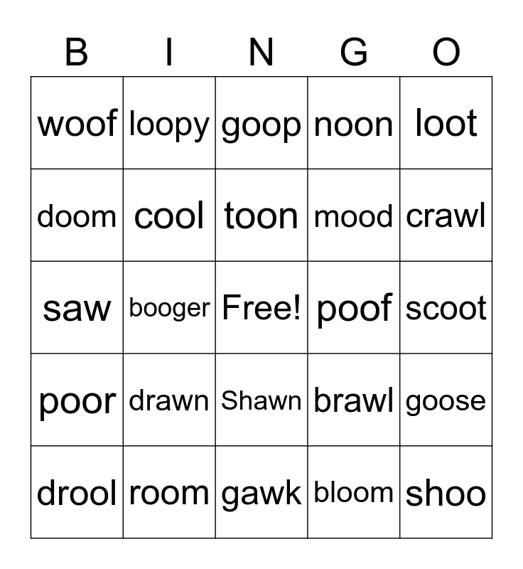 This bingo card has a free space and 62 words: soon, room, moon, poor, pool, soon, cool, root, mood, boot, noon, zoom, doom, wool, loom, woof, shoo, loot, toot, toon, poof, goop, drool, bloom, booth, boost, gloom, scoop, goose, troop, booze, roomy, noose, moose, scoot, loopy, igloo, vroom, booger, raw, saw, straw, drawn, awful, crawl, brawl, shawl, prawn, hawks, lawn, Shawn, gawk, flaw, gnaw, fawn, brawn, dawn, bawl, thaw, yawn, claw and scrawny.