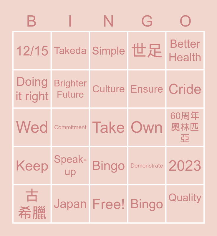This bingo card has 25 words: Keep, Japan, Take, Bingo, Better Health, 12/15, Takeda, Simple, Own, 2023, Doing it right, Brighter Future, Free!, Demonstrate, Cride, 古 希臘, Commitment, Culture, Ensure, 60周年奧林匹亞, Wed, Speak-up, Bingo, 世足 and Quality.
