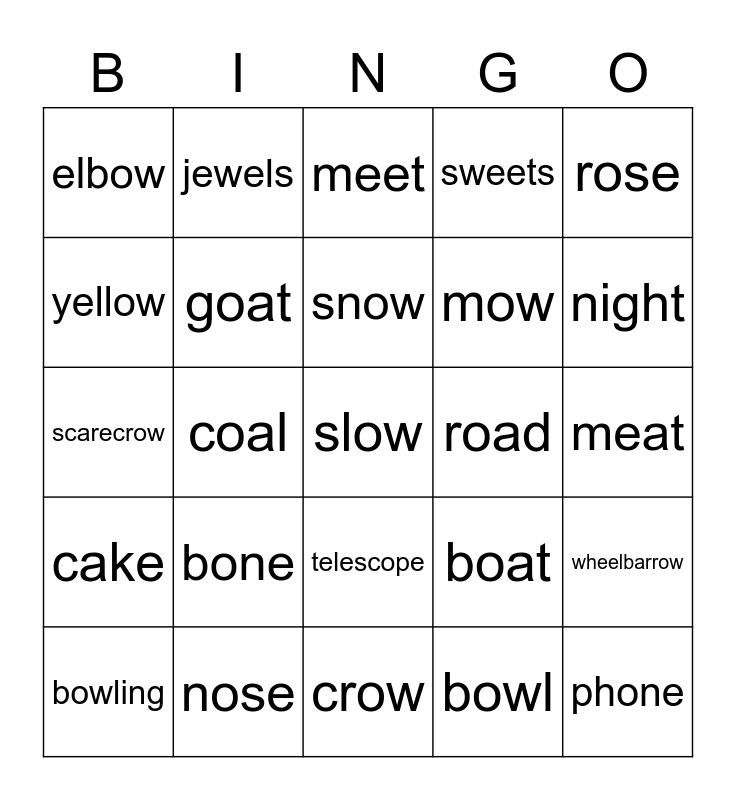 This bingo card has a free space and 24 words: bone, nose, snow, bowling, rose, elbow, yellow, jewels, road, telescope, mow, scarecrow, boat, wheelbarrow, goat, bowl, meat, meet, night, coal, phone, cake, sweets and crow.