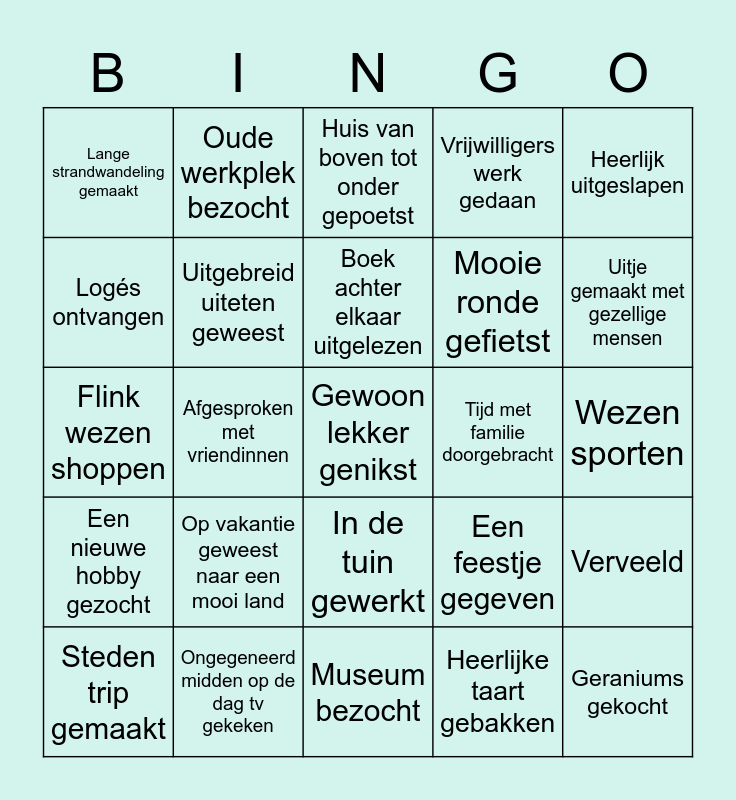 This bingo card has a free space and 24 words: Op vakantie geweest naar een mooi land, Ongegeneerd midden op de dag tv gekeken, Boek achter elkaar uitgelezen, Steden trip gemaakt, Heerlijk uitgeslapen, Lange strandwandeling gemaakt, Logés ontvangen, Oude werkplek bezocht, Tijd met familie doorgebracht, In de tuin gewerkt, Mooie ronde gefietst, Flink wezen shoppen, Een feestje gegeven, Verveeld, Uitgebreid uiteten geweest, Heerlijke taart gebakken, Wezen sporten, Huis van boven tot onder gepoetst, Uitje gemaakt met gezellige mensen, Afgesproken met vriendinnen, Geraniums gekocht, Een nieuwe hobby gezocht, Vrijwilligers werk gedaan and Museum bezocht.