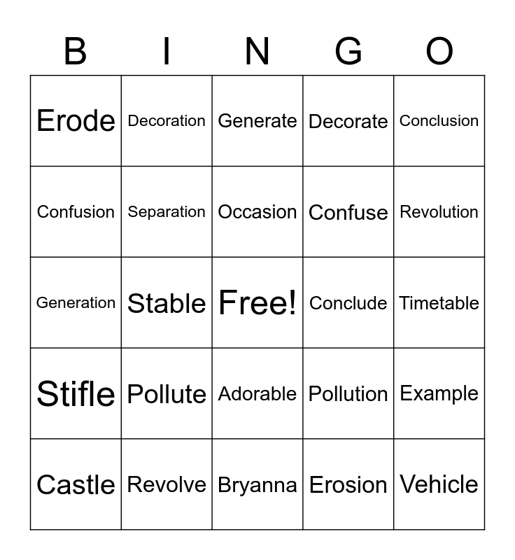 This bingo card has a free space and 24 words: Pollute, Revolve, Occasion, Castle, Conclusion, Erode, Confusion, Decoration, Conclude, Adorable, Confuse, Generation, Pollution, Example, Separation, Erosion, Timetable, Generate, Revolution, Stable, Vehicle, Stifle, Decorate and Bryanna.