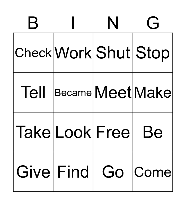 This bingo card has a free space and 15 words: Give, Come, Shut, Check, Make, Tell, Look, Go, Became, Take, Be, Stop, Meet, Work and Find.