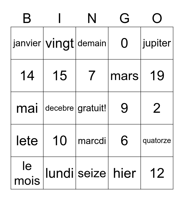 This bingo card has a free space and 24 words: 10, lundi, 7, le mois, jupiter, janvier, 14, vingt, 9, marcdi, mars, mai, 6, quatorze, 15, hier, 2, demain, 19, decebre, 12, lete, 0 and seize.