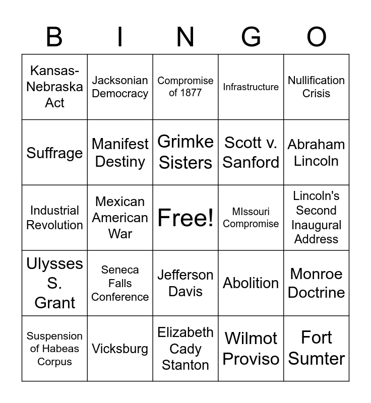 This bingo card has a free space and 48 words: Thomas "Stonewall" Jackson, Fort Sumter, Lewis and Clark, Elizabeth Cady Stanton, Seneca Falls Conference, War of 1812, Jacksonian Democracy, Erie Canal, Suffrage, Nationalism, Manifest Destiny, Infrastructure, Monroe Doctrine, Abolition, William Lloyd Garrison, Frederick Douglass, Grimke Sisters, MIssouri Compromise, Nat Turner, Nullification Crisis, Mexican American War, Wilmot Proviso, Kansas-Nebraska Act, Scott v. Sanford, John Brown, Abraham Lincoln, Suspension of Habeas Corpus, Emancipation Proclamation, Jefferson Davis, Ulysses S. Grant, Robert E. Lee, William Tecumseh Sherman, Antietam, Gettysburg, Vicksburg, Atlanta, Gettysburg Address, Lincoln's Second Inaugural Address, Presidential Reconstruction, Freedmen's Bureau, Black Codes, Ku Klux Klan, Compromise of 1877, Rutherford B. Hayes, Industrial Revolution, Diplomacy, Louisiana Purchase and Temperance.