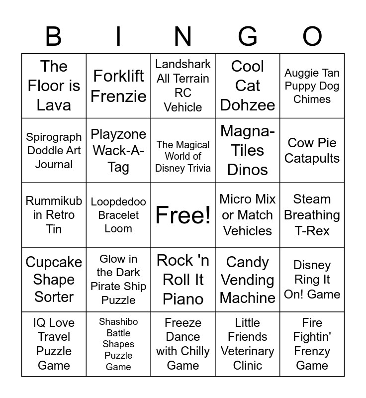 This bingo card has a free space and 34 words: Light-Up Indoor Golf, Little Friends Veterinary Clinic, Puzzle by Number Earth, Battling Tops, Cupcake Shape Sorter, Playzone Wack-A-Tag, Auggie Tan Puppy Dog Chimes, IQ Love Travel Puzzle Game, Forklift Frenzie, The Amazing Gravity Blox, The Magical World of Disney Trivia, Landshark All Terrain RC Vehicle, Obstacle Course in a Box, Learn to Build Dinosaurs, Micro Mix or Match Vehicles, Cow Pie Catapults, Shashibo Battle Shapes Puzzle Game, Rummikub in Retro Tin, Glow in the Dark Pirate Ship Puzzle, Candy Vending Machine, Rock 'n Roll It Piano, Dimpl Splash, The Floor is Lava, Steam Breathing T-Rex, Freeze Dance with Chilly Game, Fire Fightin' Frenzy Game, Cool Cat Dohzee, Rollables Tumble Tree, Magna-Tiles Dinos, Spirograph Doddle Art Journal, Giant Spoons Game, Loopdedoo Bracelet Loom, Disney Ring It On! Game and Science4you - Yucky Science Kit.