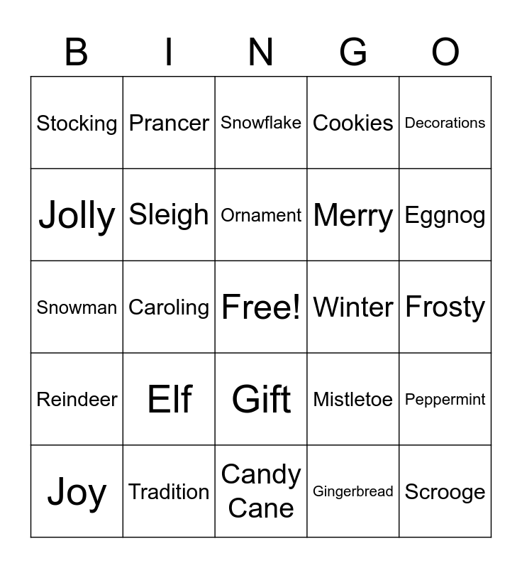 This bingo card has a free space and 25 words: Elf, Candy Cane, Ornament, Joy, Decorations, Stocking, Jolly, Prancer, Winter, Gift, Merry, Snowman, Mistletoe, Peppermint, Sleigh, North Pole, Frosty, Snowflake, Eggnog, Caroling, Scrooge, Tradition, Reindeer, Cookies and Gingerbread.