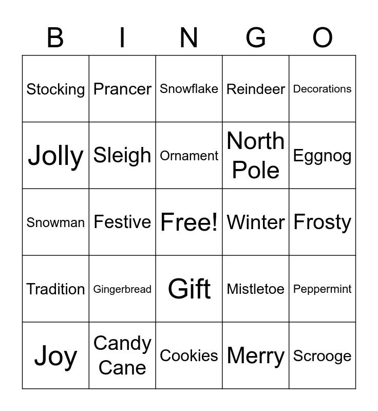This bingo card has a free space and 24 words: Gingerbread, Candy Cane, Ornament, Joy, Decorations, Stocking, Jolly, Prancer, Winter, Gift, North Pole, Snowman, Mistletoe, Peppermint, Sleigh, Merry, Frosty, Snowflake, Eggnog, Festive, Scrooge, Tradition, Reindeer and Cookies.