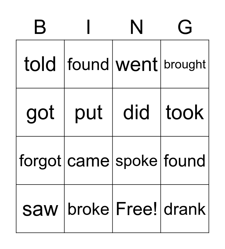 This bingo card has 17 words: Free!, saw, went, told, came, brought, found, did, took, put, broke, spoke, got, found, forgot, ate and drank.
