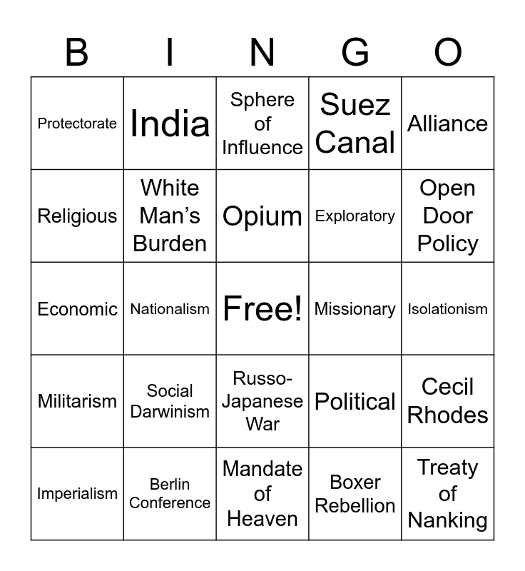 This bingo card has a free space and 29 words: Imperialism, Racism, Nationalism, Colony, Protectorate, Sphere of Influence, White Man’s Burden, Social Darwinism, Missionary, Berlin Conference, Isolationism, Treaty of Nanking, Mandate of Heaven, Boxer Rebellion, Open Door Policy, Meiji Restoration, Russo-Japanese War, Militarism, Alliance, Economic, Political, Ideological, Exploratory, Religious, Suez Canal, India, Cecil Rhodes, Opium and South Africa.