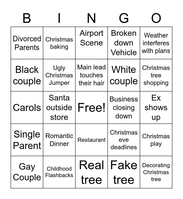 This bingo card has a free space and 29 words: Gay Couple, Hot Chocolate, Santa outside store, Dead Parent, Divorced Parents, Airport Scene, Ugly Christmas Jumper, Romantic Dinner, Business closing down, Childhood Flashbacks, Ex shows up, Decorating Christmas tree, Real tree, Fake tree, Christmas tree shopping, Coffeeshop/Bakery, Restaurant, Single Parent, Weather interferes with plans, Carols, Christmas eve deadlines, Arguments, White couple, Black couple, Broken down Vehicle, Christmas baking, Christmas play, Main lead touches their hair and Enemies to Lovers.