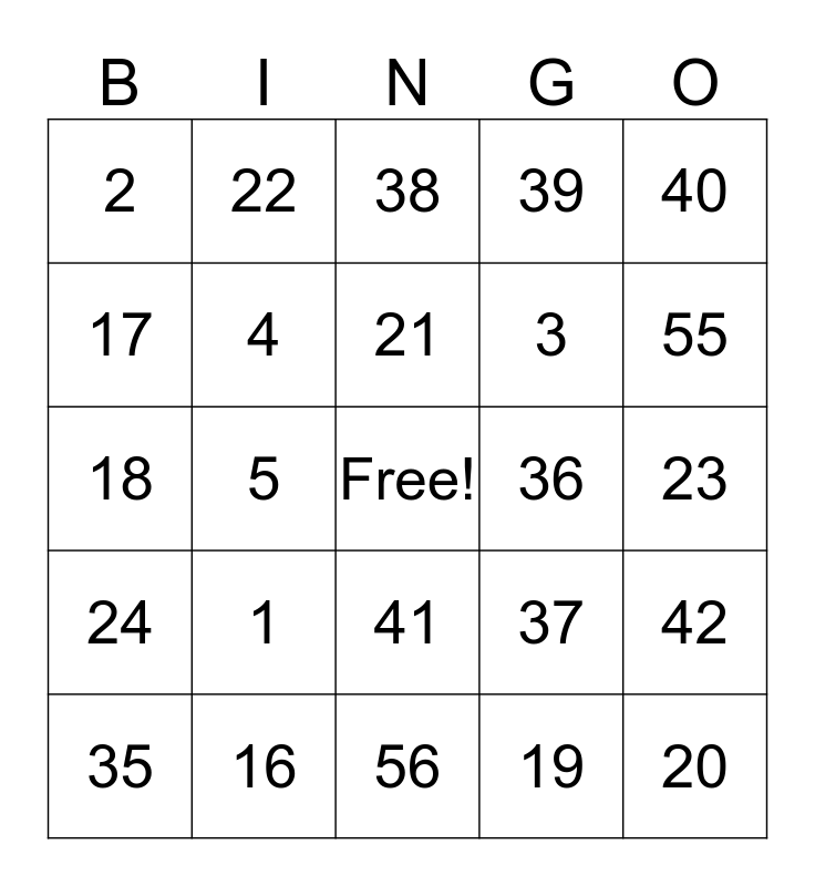 This bingo card has a free space and 24 words: 1, 16, 21, 35, 40, 2, 17, 22, 36, 41, 3, 18, 37, 42, 4, 19, 23, 38, 55, 5, 20, 24, 39 and 56.
