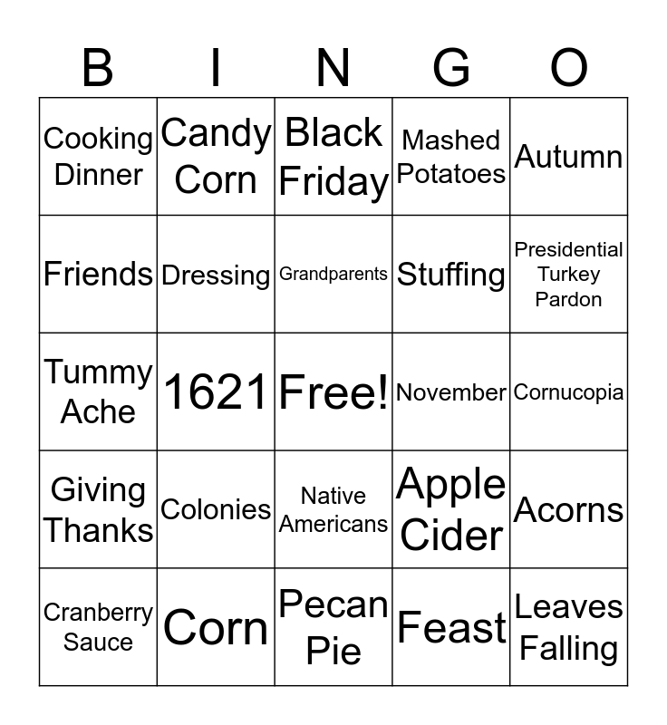 This bingo card has a free space and 54 words: Thanksgiving Day, Giving Thanks, Turkey, Pilgrims, Native Americans, Pumpkin Pie, Mashed Potatoes, Family, Friends, Gravy, Cooking Dinner, Fall Harvest, Corn, Cranberry Sauce, Mayflower, Pecan Pie, Leaves Falling, Stuffing, Yams, Cornucopia, Apple Cider, Gobble Gobble, November, Autumn, Casserole, Candy Corn, Ham, Football, Turkey Leg, Feast, Macy's Parade, Annoying Relatives, Tradition, Sales Ads, Black Friday, Nap, Tummy Ache, Acorns, Pumpkin, Dressing, Thursday, Holiday, Rolls, Plymouth Rock, Colonies, Leftovers, Heart Burn, Cousins, Grandparents, 1621, Presidential Turkey Pardon, Allegro, Nuts and Celebration.