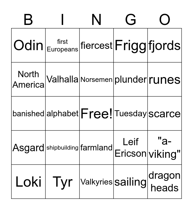 This bingo card has a free space and 42 words: Vikings, Norsemen, raiders, shipbuilding, sailing, "a-viking", dragon heads, berserkers, fiercest, farmland, scarce, runes, alphabet, fjords, mountains, Leif Ericson, Eric the Red, banished, birds, first Europeans, North America, Greenland, Norse mythology, Odin, Thor, 16 letters, plunder, ransom, prow, Iceland, Yggdrasill, Asgard, Valhalla, Valkyries, Sif, Loki, Tyr, Tuesday, Wednesday, Thursday, Frigg and Balder.