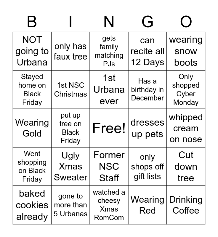 This bingo card has a free space and 25 words: Ugly Xmas Sweater, watched a cheesy Xmas RomCom, 1st Urbana ever, baked cookies already, wearing snow boots, NOT going to Urbana, Stayed home on Black Friday, only has faux tree, dresses up pets, Former NSC Staff, Has a birthday in December, Wearing Gold, only shops off gift lists, Cut down tree, 1st NSC Christmas, Wearing Green, whipped cream on nose, gets family matching PJs, Only shopped Cyber Monday, put up tree on Black Friday, Drinking Coffee, gone to more than 5 Urbanas, Went shopping on Black Friday, can recite all 12 Days and Wearing Red.