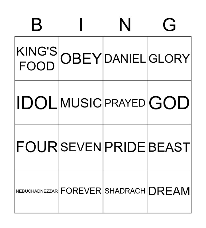 This bingo card has a free space and 15 words: NEBUCHADNEZZAR, DREAM, DANIEL, KING'S FOOD, GOD, IDOL, SEVEN, SHADRACH, MUSIC, FOUR, BEAST, GLORY, PRAYED, OBEY and FOREVER.