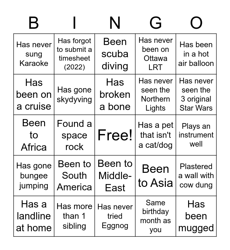 This bingo card has a free space and 34 words: Never broken a bone, Same birthday month as you, Shares 2+ letters with your first name, Fluent in 3 or more languages, Has gone bungee jumping, Has gone skydyving, Has been in a hot air balloon, Has a landline at home, Has forgot to submit a timesheet (2022), Has a severe food allergy, Has broken a bone, Been scuba diving, Has a dog at home, Has a cat at home, Has a pet that isn't a cat/dog, Has never seen the 3 original Star Wars, Has more than 1 sibling, Been to Africa, Been to South America, Been to Asia, Been to Middle-East, Been to Australia/New Zealand, Has never sung Karaoke, Plays an instrument well, Has never tried Eggnog, Has been mugged, Has never been on Ottawa LRT, Has shot a gun, Has never seen the Northern Lights, Has been on a cruise, Has ridden a motorcycle, Found a space rock, Plastered a wall with cow dung and Swam in the Dead Sea.