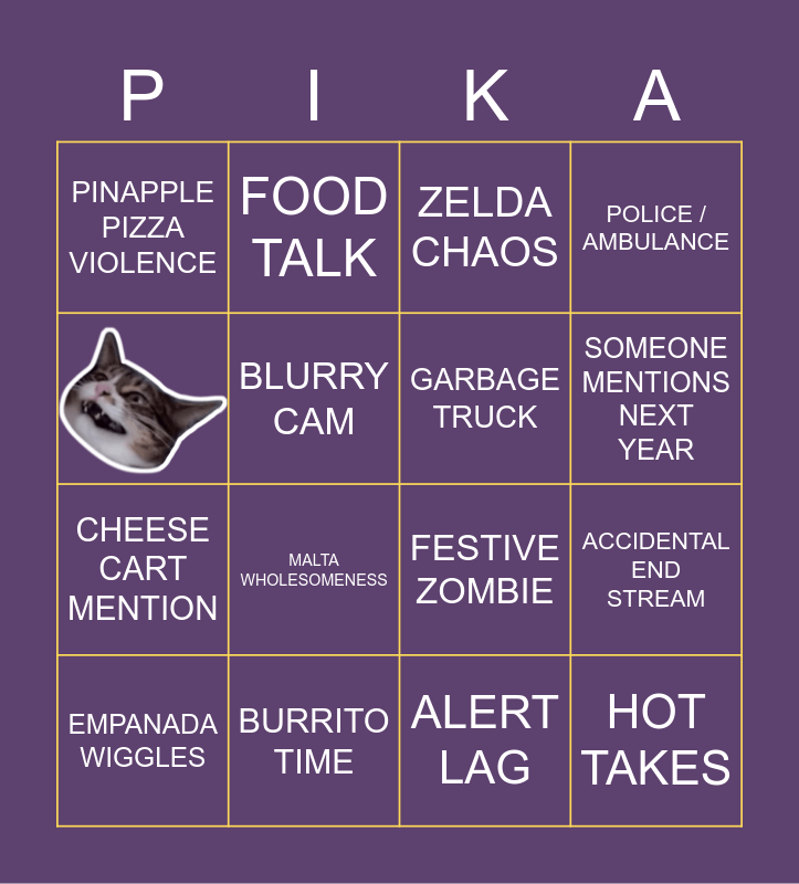 This bingo card has 1 images and 15 words: BURRITO TIME, ACCIDENTAL END STREAM, ZELDA CHAOS, PINAPPLE PIZZA VIOLENCE, CHEESE CART MENTION, FOOD TALK, FESTIVE ZOMBIE, ALERT LAG, BLURRY CAM, EMPANADA WIGGLES, POLICE / AMBULANCE, MALTA WHOLESOMENESS, SOMEONE MENTIONS NEXT YEAR, GARBAGE TRUCK and HOT TAKES.