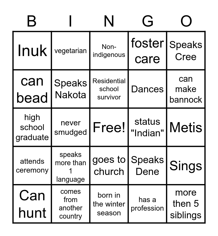 This bingo card has a free space and 24 words: speaks more than 1 language, comes from another country, Residential school survivor, Can hunt, Speaks Cree, Inuk, can bead, vegetarian, status "Indian", goes to church, Dances, high school graduate, Speaks Dene, Sings, Speaks Nakota, has a profession, Metis, Non-indigenous, can make bannock, never smudged, more then 5 siblings, attends ceremony, foster care and born in the winter season.