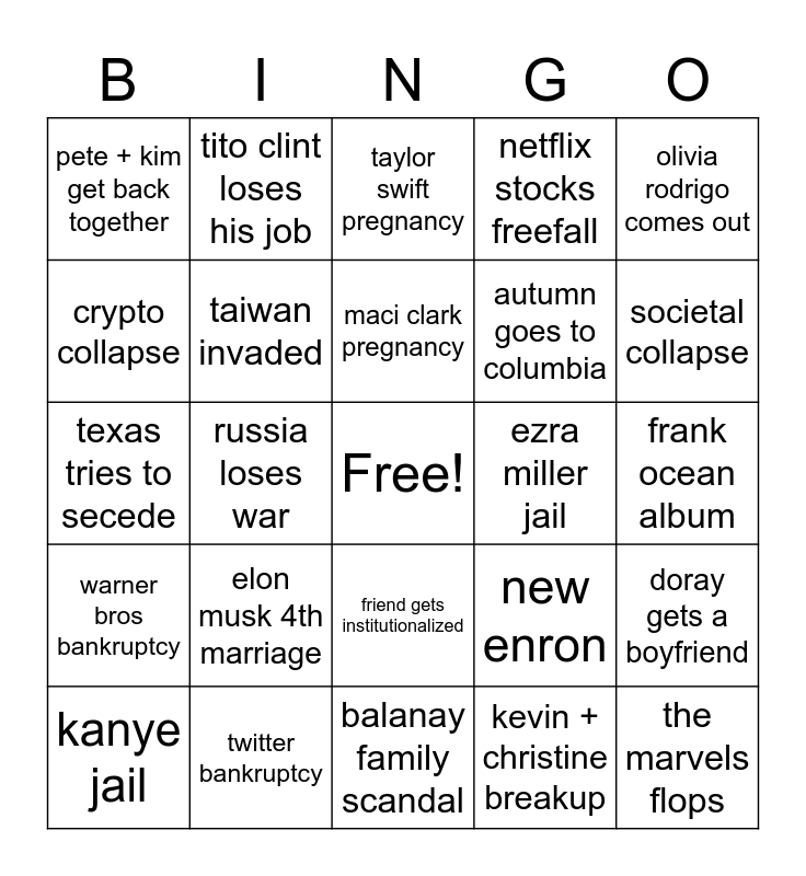 This bingo card has a free space and 24 words: elon musk 4th marriage, twitter bankruptcy, maci clark pregnancy, kanye jail, olivia rodrigo comes out, pete + kim get back together, crypto collapse, tito clint loses his job, ezra miller jail, friend gets institutionalized, autumn goes to columbia, texas tries to secede, new enron, doray gets a boyfriend, taiwan invaded, kevin + christine breakup, frank ocean album, taylor swift pregnancy, societal collapse, russia loses war, the marvels flops, warner bros bankruptcy, netflix stocks freefall and balanay family scandal.