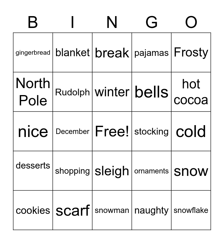 This bingo card has a free space and 32 words: naughty, Elf, December, sledding, desserts, Rudolph, Frosty, snow, blanket, lights, winter, break, icicles, fireplace, stocking, presents, cookies, nice, sleigh, shopping, ornaments, candy cane, cold, scarf, snowflake, pajamas, bells, North Pole, gingerbread, snowman, wrapping presents and hot cocoa.