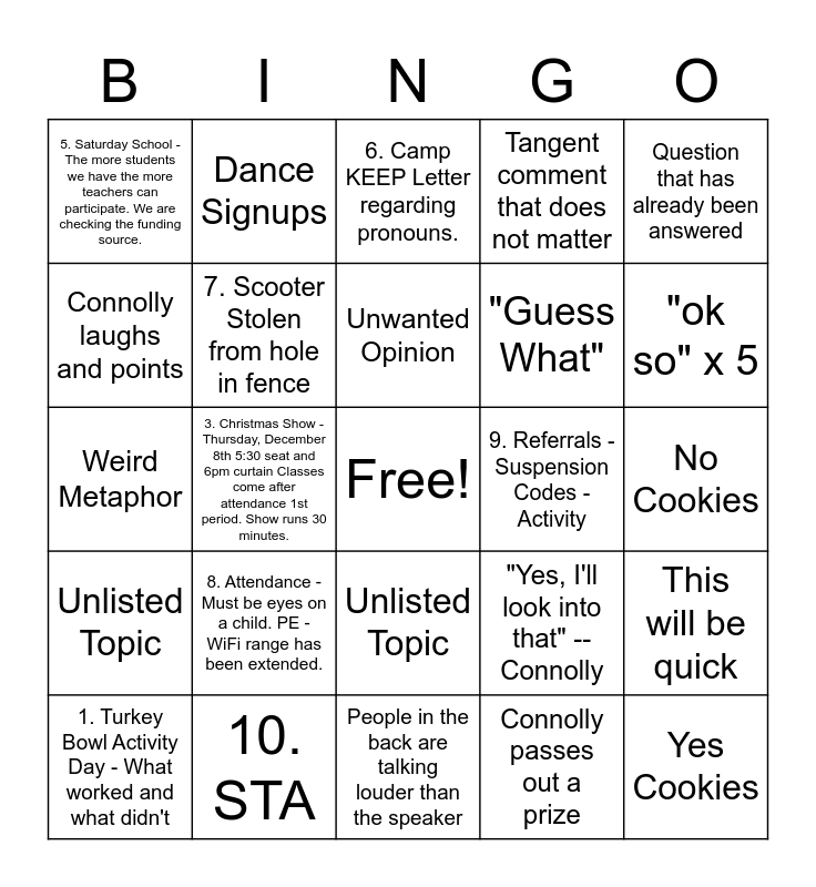 This bingo card has a free space and 29 words: 1. Turkey Bowl Activity Day - What worked and what didn't, 2. Jeremy Hanson - Referral and PBIS data, 3. Christmas Show - Thursday, December 8th 5:30 seat and 6pm curtain Classes come after attendance 1st period. Show runs 30 minutes., 4. Career Day - February 8th, 5. Saturday School - The more students we have the more teachers can participate. We are checking the funding source., 6. Camp KEEP Letter regarding pronouns., 7. Scooter Stolen from hole in fence, 8. Attendance - Must be eyes on a child. PE - WiFi range has been extended., 9. Referrals - Suspension Codes - Activity, 10. STA, No Cookies, Yes Cookies, People in the back are talking louder than the speaker, Connolly passes out a prize, "ok so" x 5, Someone comes in late, Unlisted Topic, Unlisted Topic, Question that has already been answered, Weird Metaphor, "Yes, I'll look into that" --Connolly, Random Comment, "Guess What", Connolly laughs and points, Tangent comment that does not matter, Dance Signups, This will be quick, Unwanted Opinion and Cellphone goes off.