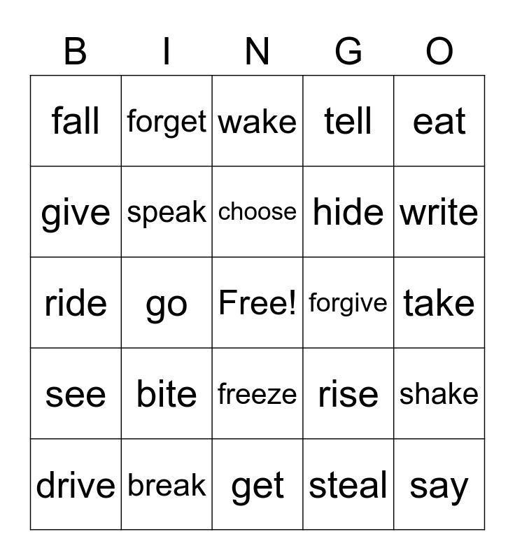 This bingo card has a free space and 24 words: bite, break, choose, drive, eat, fall, give, forget, forgive, freeze, hide, ride, rise, shake, speak, steal, take, wake, write, go, say, see, tell and get.