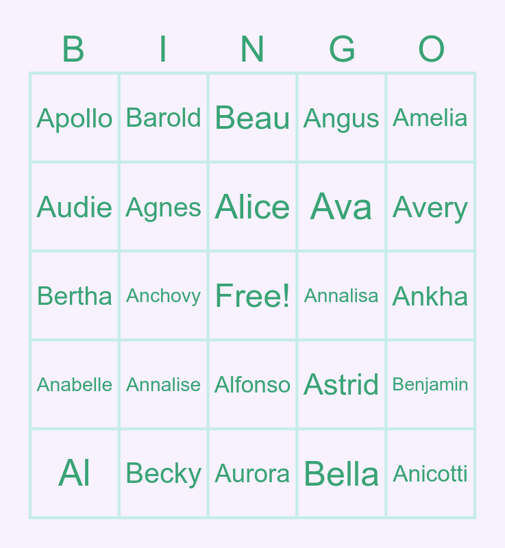 This bingo card has a free space and 39 words: Ace, Admiral, Agent S, Agnes, Al, Alfonso, Alice, Alli, Amelia, Anabelle, Anchovy, Angus, Anicotti, Ankha, Annalisa, Annalise, Antonio, Apollo, Apple, Astrid, Audie, Aurora, Ava, Avery, Axel, Azalea, Baabara, Bam, Bangle, Barold, Bea, Beardo, Beau, Becky, Bella, Benedict, Benjamin, Bertha and Bettina.