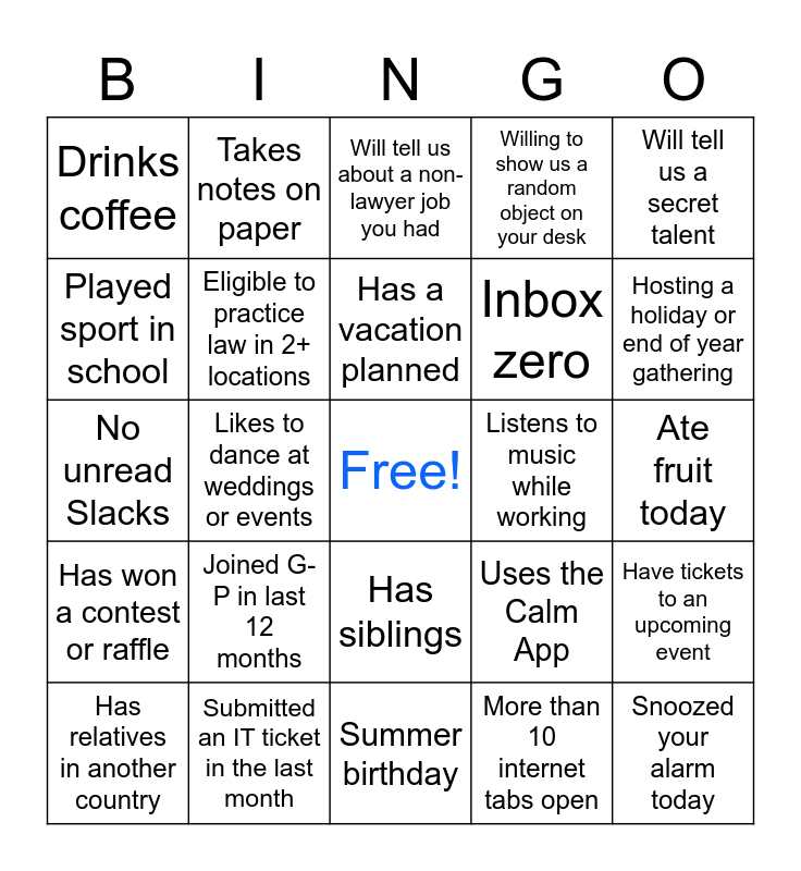 This bingo card has a free space and 24 words: Joined G-P in last 12 months, Submitted an IT ticket in the last month, Has a vacation planned, Has relatives in another country, Will tell us a secret talent, Drinks coffee, Played sport in school, Takes notes on paper, Listens to music while working, Has siblings, Inbox zero, No unread Slacks, Uses the Calm App, Have tickets to an upcoming event, Eligible to practice law in 2+ locations, More than 10 internet tabs open, Ate fruit today, Will tell us about a non-lawyer job you had, Hosting a holiday or end of year gathering, Likes to dance at weddings or events, Snoozed your alarm today, Has won a contest or raffle, Willing to show us a random object on your desk and Summer birthday.