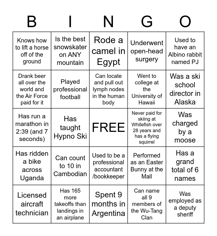 This bingo card has a free space and 24 words: Can count to 10 in Cambodian, Has 165 more takeoffs than landings in an airplane, Can locate and pull out lymph nodes in the human body, Licensed aircraft technician, Used to have an Albino rabbit named PJ, Knows how to lift a horse off of the ground, Drank beer all over the world and the Air Force paid for it, Is the best snowskater on ANY mountain, Never paid for skiing at Whitefish over 28 years and has a flying squirrel, Used to be a professional accountant /bookkeeper, Went to college at the University of Hawaii, Has run a marathon in 2:39 (and 7 seconds), Performed as an Easter Bunny at the Mall, Has a grand total of 6 names, Played professional football, Can name all 9 members of the Wu-Tang Clan, Was charged by a moose, Rode a camel in Egypt, Was a ski school director in Alaska, Has taught Hypno Ski, Was employed as a deputy sheriff, Has ridden a bike across Uganda, Underwent open-head surgery and Spent 9 months in Argentina.