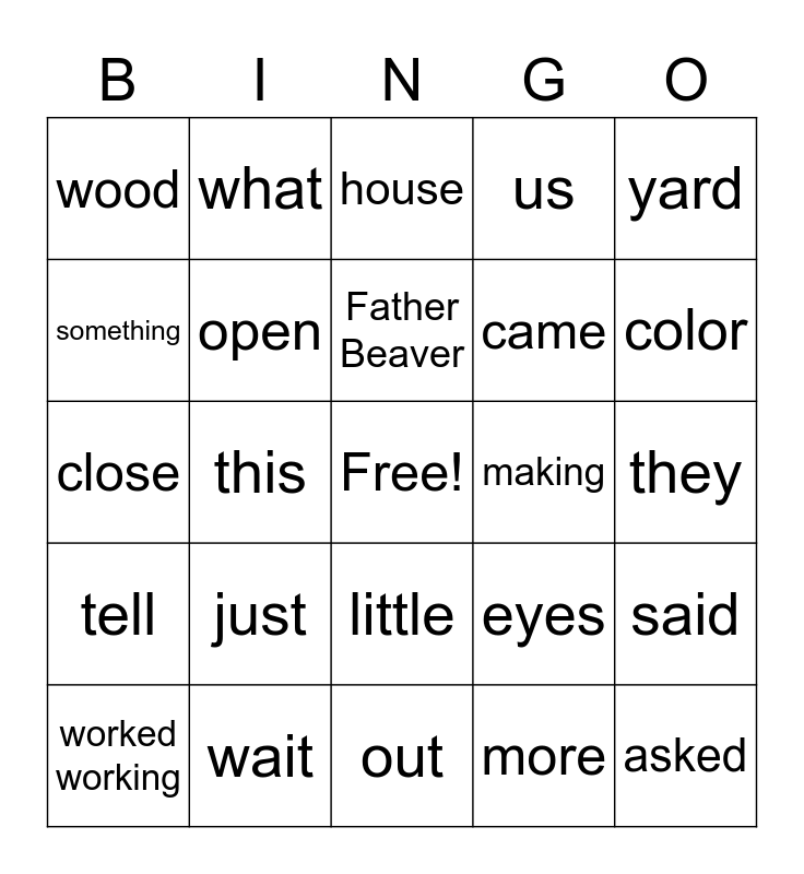 This bingo card has a free space and 24 words: just, wait, Father Beaver, worked working, yard, wood, something, what, making, little, came, close, eyes, said, open, more, they, house, color, this, asked, tell, us and out.