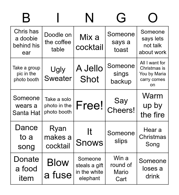 This bingo card has a free space and 27 words: Someone slips, Someone spills a drink, Someone sings backup, Someone steals a gift in the white elephant, Take a group pic in the photo booth, Mix a cocktail, Doodle on the coffee table, Dance to a song, Say Cheers!, Hear a Christmas Song, Someone wears a Santa Hat, Someone says a toast, Donate a food item, Blow a fuse, All I want for Christmas is You by Maria carry comes on, Someone talks about the weather, Ugly Sweater, A Jello Shot, Ryan makes a cocktail, Chris has a doobie behind his ear, Warm up by the fire, Win a round of Mario Cart, Take a solo photo in the photo booth, Someone loses a drink, It Snows, Someone says lets not talk about work and Say hi to baby Jane.