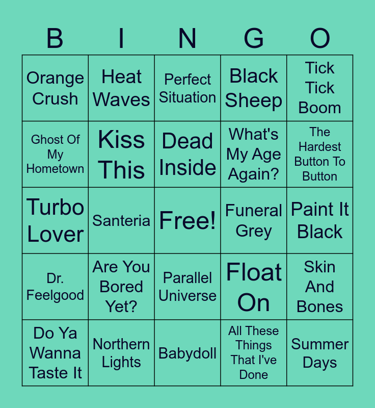 This bingo card has a free space and 50 words: Honeypie, Summer Days, Can I Be Your Lover, Babydoll, Are You Bored Yet?, Ophelia, Heat Waves, High Low, Ghost Of My Hometown, What, Me Worry?, Kiss This, Black Sheep, Skin And Bones, Float On, Could Have Been Me, Hazy Shade Of Winter, Dead Inside, Funeral Grey, Another Hit Of Showmanship, Tick Tick Boom, Santeria, All These Things That I've Done, Orange Crush, What's My Age Again?, The One I Love, Blitzkrieg Bop, The Hardest Button To Button, Go With The Flow, Perfect Situation, Parallel Universe, Liztomania, Genghis Khan, Believe, Sweet Disposition, Northern Lights, Chew Me Up, Darkness At The Heart Of My Love, Lola Montez, Make Me Wanna Die, Paint It Black, Land Of Confusion, Turn Me Loose, Carry On Wayward Son, Fox On The Run, Do Ya Wanna Taste It, Turbo Lover, Heartbreaker, Back In Time, Dr. Feelgood and Here I Go Again.