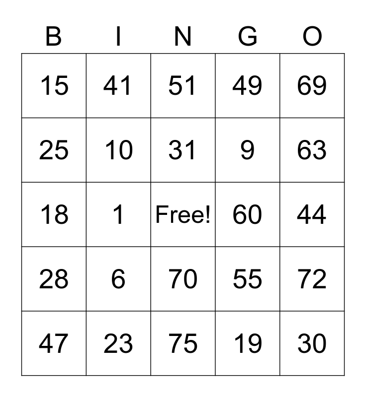 This bingo card has a free space and 24 words: 6, 23, 31, 47, 69, 15, 25, 41, 60, 70, 9, 18, 55, 72, 10, 19, 44, 51, 63, 1, 30, 28, 49 and 75.