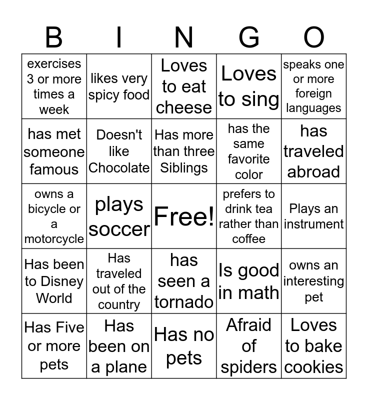 This bingo card has a free space and 24 words: Has traveled out of the country, Has been on a plane, Has more than three Siblings, Has Five or more pets, speaks one or more foreign languages, exercises 3 or more times a week, has met someone famous, likes very spicy food, prefers to drink tea rather than coffee, has seen a tornado, has the same favorite color, owns a bicycle or a motorcycle, Is good in math, owns an interesting pet, Doesn't like Chocolate, Afraid of spiders, Plays an instrument, Loves to eat cheese, has traveled abroad, plays soccer, Loves to bake cookies, Has been to Disney World, Loves to sing and Has no pets.